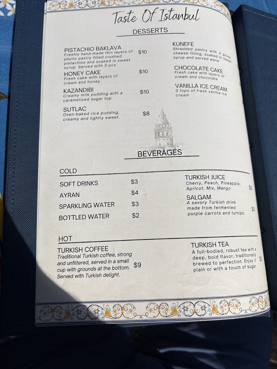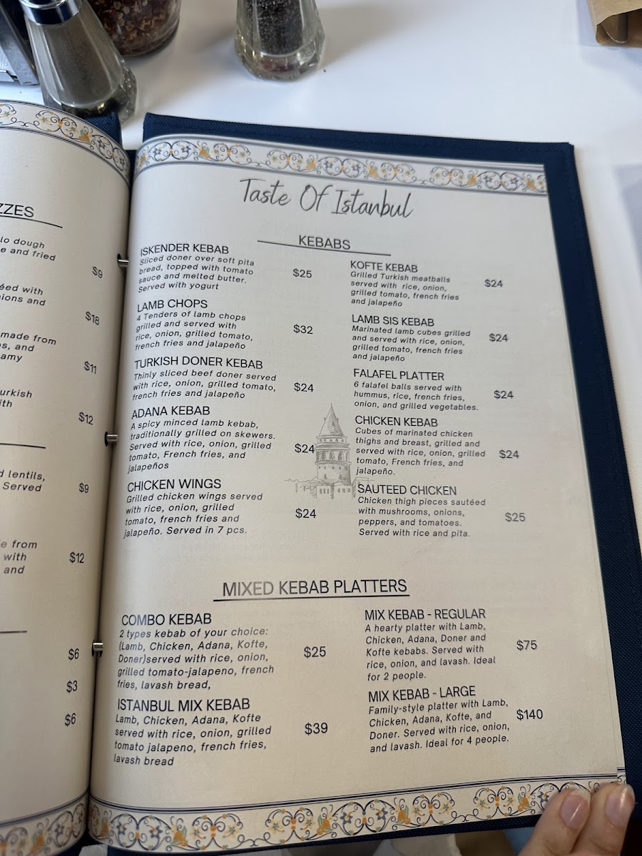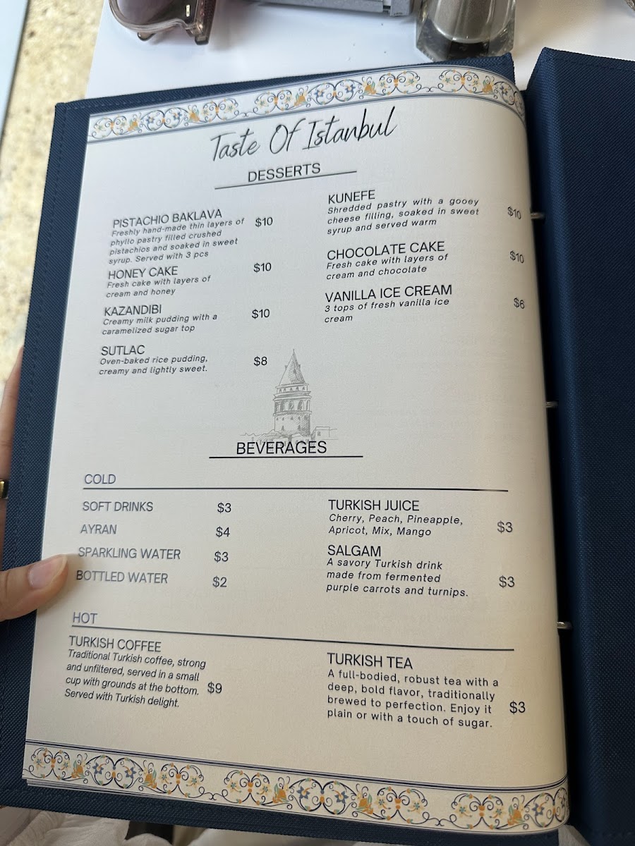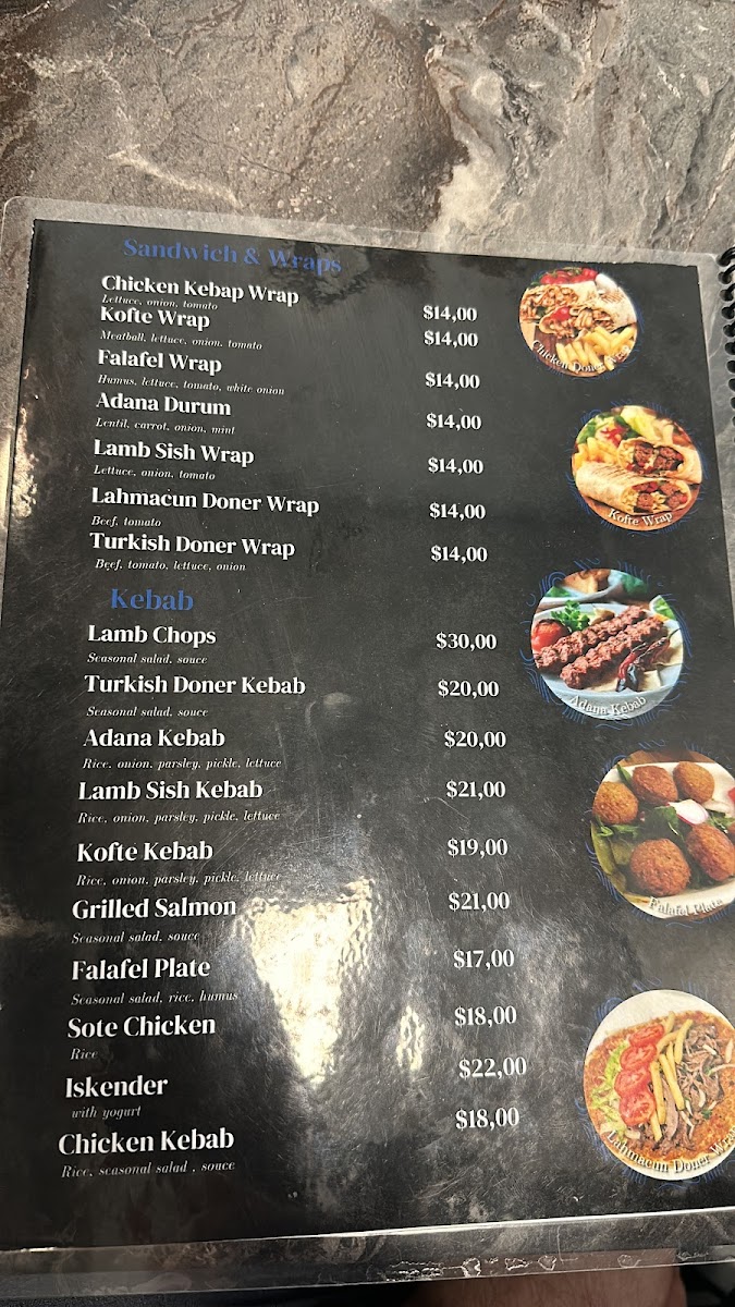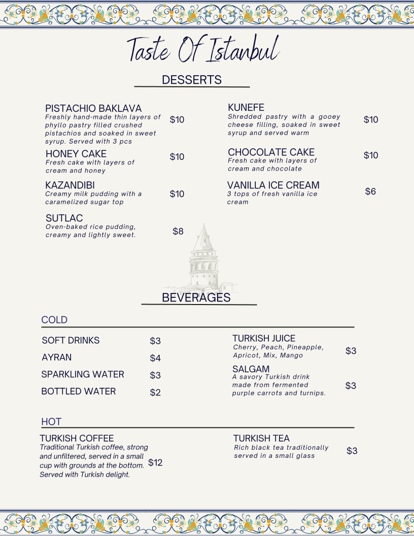 If you’re in the mood for something a little different, you can’t go wrong with their Flatbreads / Pide. The Mixed Pide, topped with a medley of doner beef, pastrami, and mozzarella cheese, is a standout favorite that guarantees cheesy, savory goodness in every bite. And for those with a sweet tooth, don't miss the Pistachio Baklava or the exquisitely made Kunefe, both desserts perfected to mimic the authentic tastes of Turkey.
