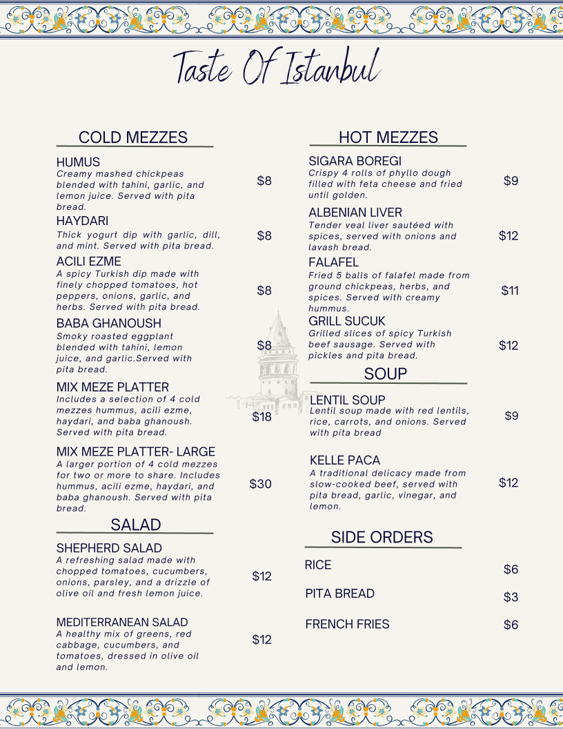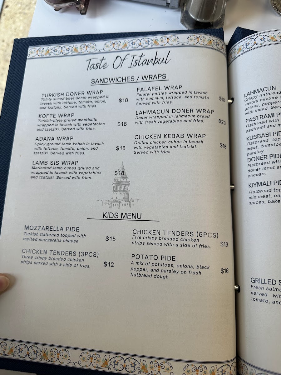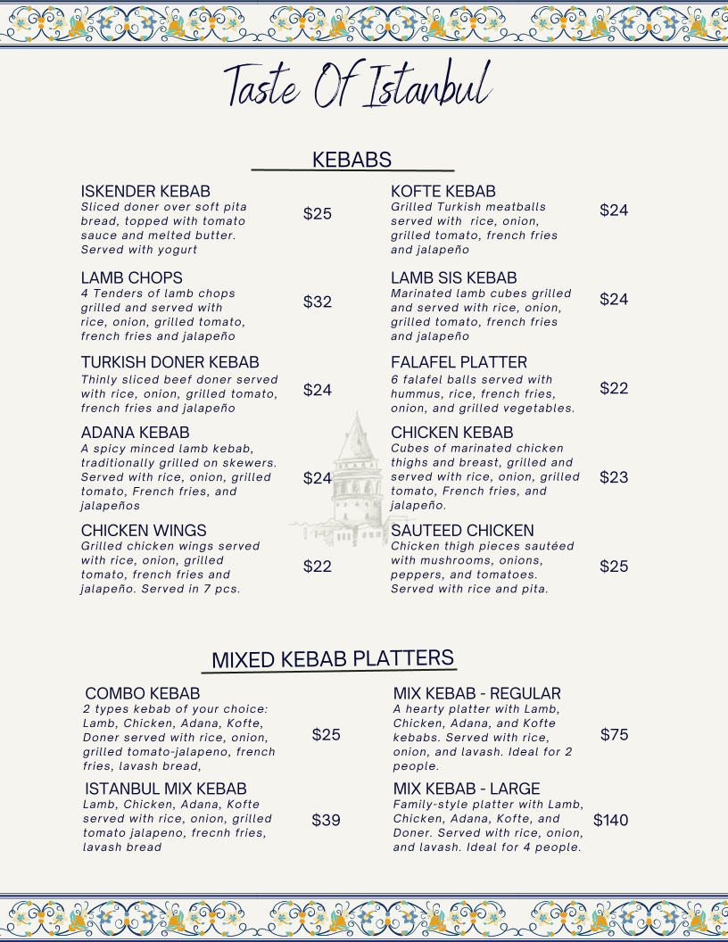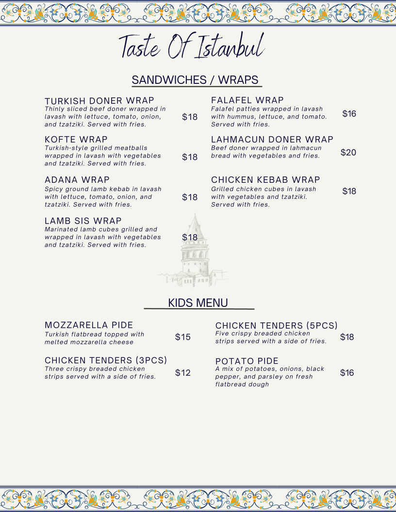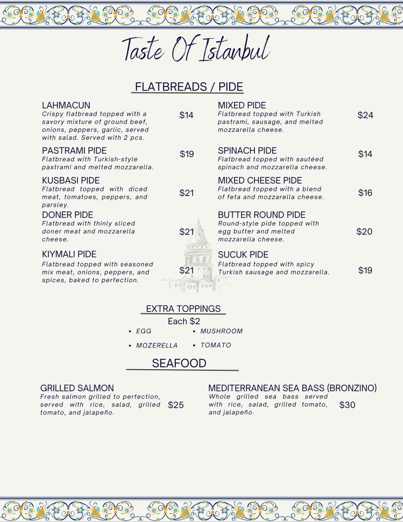 If you’re in the mood for something a little different, you can’t go wrong with their Flatbreads / Pide. The Mixed Pide, topped with a medley of doner beef, pastrami, and mozzarella cheese, is a standout favorite that guarantees cheesy, savory goodness in every bite. And for those with a sweet tooth, don't miss the Pistachio Baklava or the exquisitely made Kunefe, both desserts perfected to mimic the authentic tastes of Turkey.